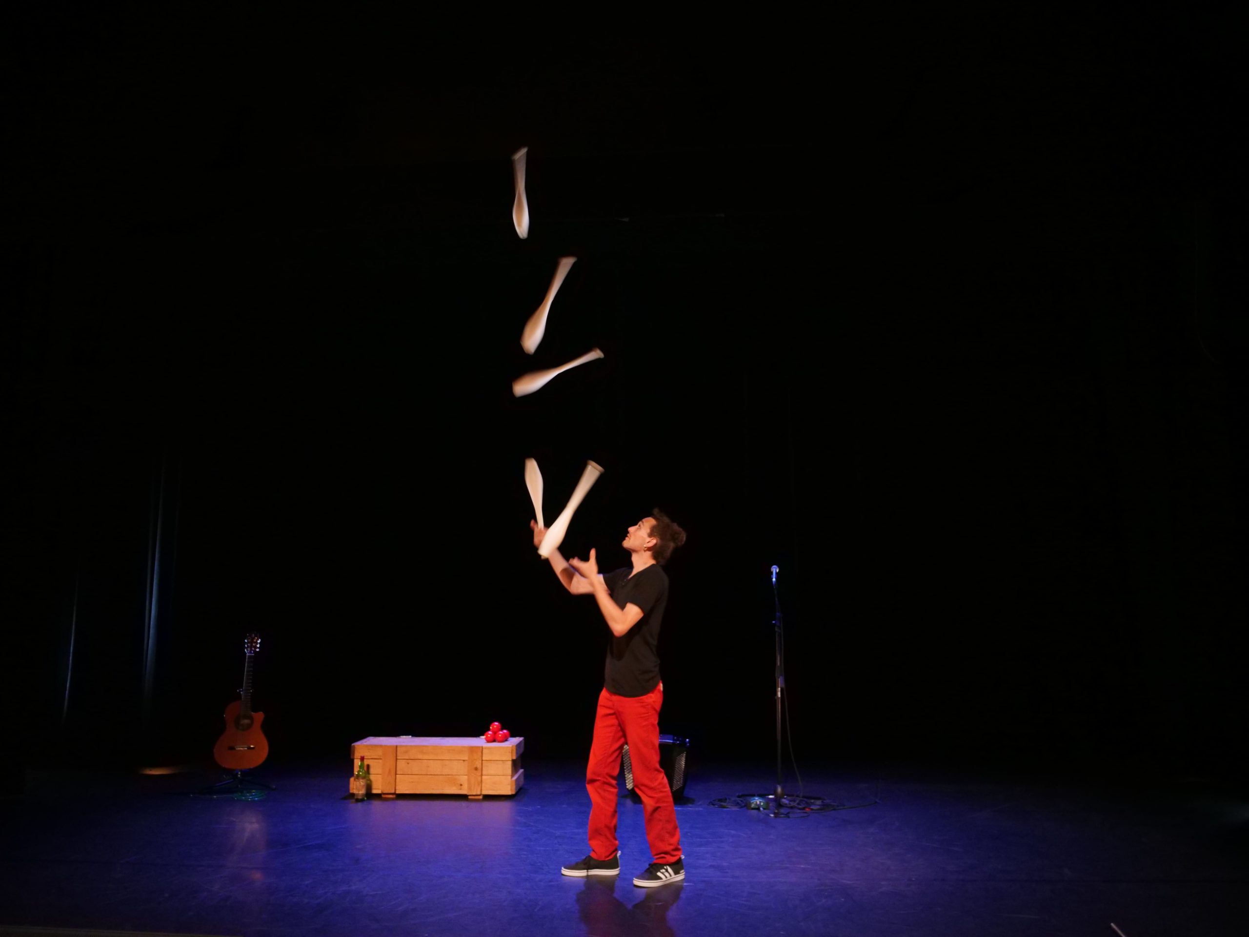 Une histoire tendre, en clair obscur, où un narrateur complice n’aura de cesse de jongler (au sens propre comme au figuré) avec balles, massues, mots et sons pour faire naître dans vos têtes les images de cette histoire singulière.
